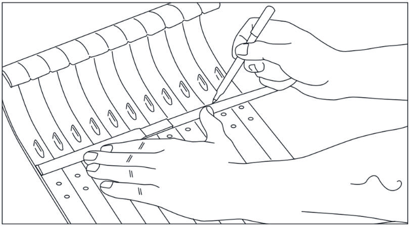 Ved montering kan tagrender enten placeres vandret eller med en lille hældning. Faldet opnås ved at tegne bukkemærkerne en smule skråt (se billedet). Bukket på rendejernene skal foregå mindst 10 mm fra bagkrogene. . Brug en Plastmo Rendejernsbukker til at bukke rendejernene i den rette vinkel, så rendens forkant er ca. 2 mm lavere end bagkanten efter montering.